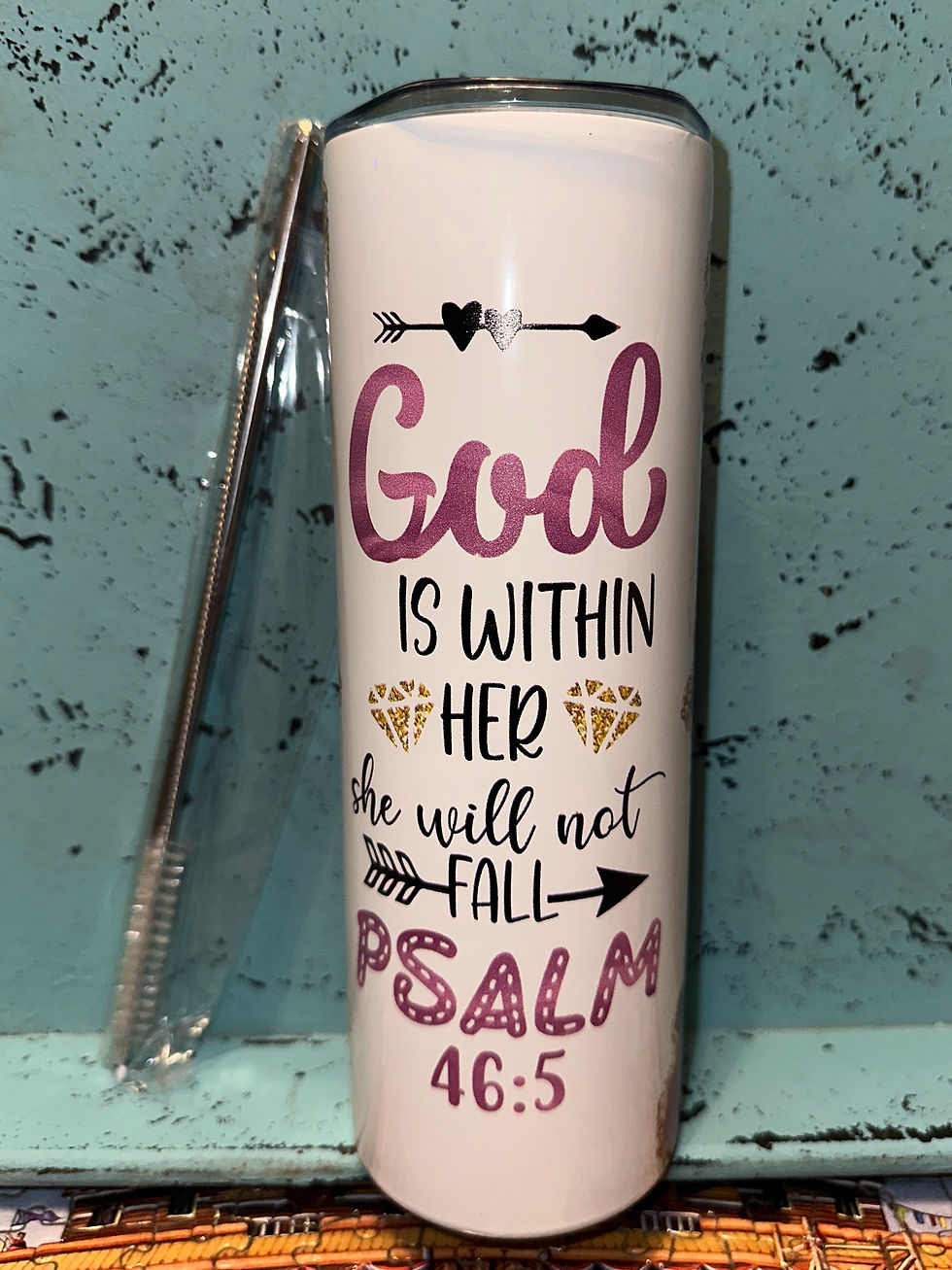 20oz Stainless Steel Tumbler With Lid & Straw “God is Within Her” Psalm 46:5